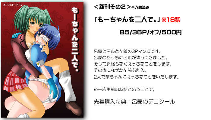 その他の既刊在庫は、「今宵の宴」「Beautiful Monster」「くれいもあのさんぴぃぼんDX」(残少)「Freedom」(残少)「関さんは私のモノですっ!!」を予定しています。